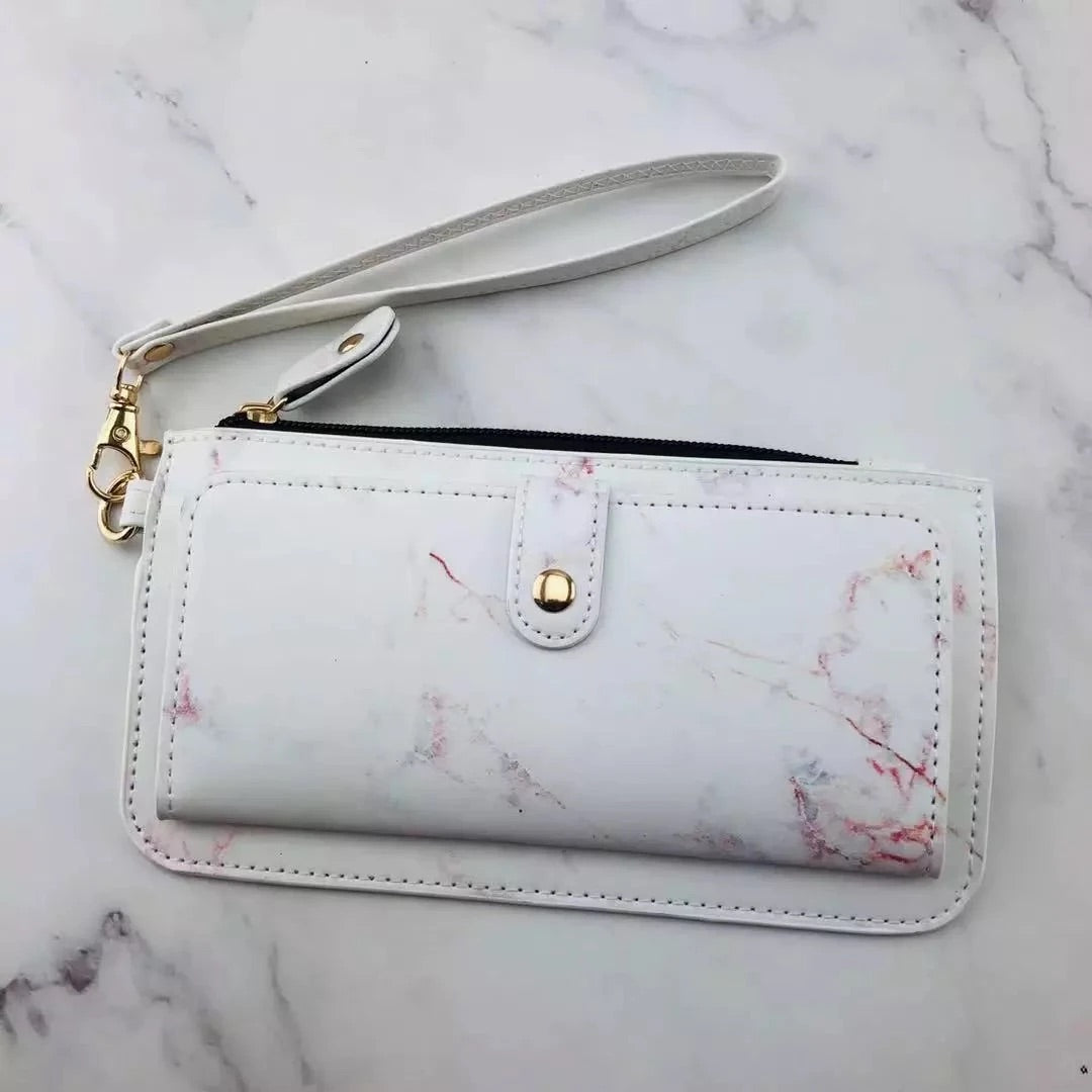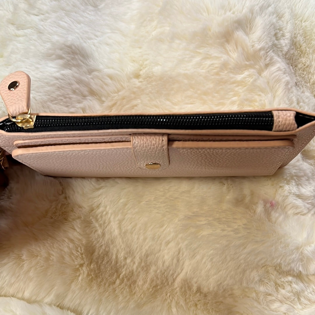The compartments inside offer a spot for your smartphone, credit cards, cash and coins! And it comes with a coordinating wristlet strap.
