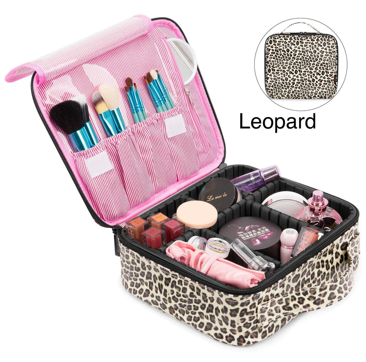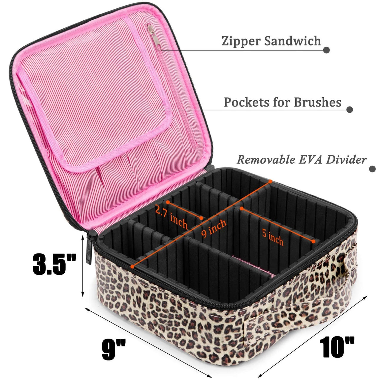 *10.2 x 9.4 x 3.7 inches with hard PU interior dividers that can be adjusted into 7 compartments to separate different type of cosmetics, makeup tools, toiletries, jewelry and digital accessories.